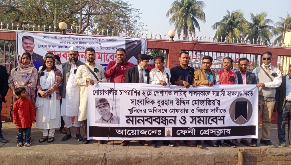 সাংবাদিক মুজাক্কির হত্যার প্রতিবাদে ফেনী প্রেসক্লাবের মানববন্ধন