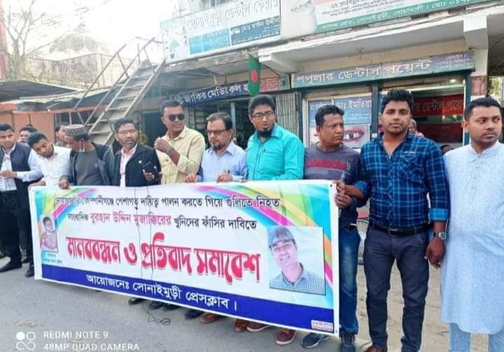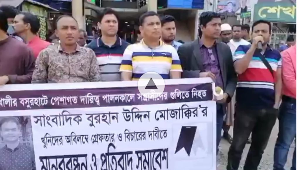 সাংবাদিক মুজাক্কিরের হত্যাকারীদের গ্রেফতারের দাবিতে সোনাগাজীতে মানববন্ধন ও প্রতিবাদ সমাবেশ
