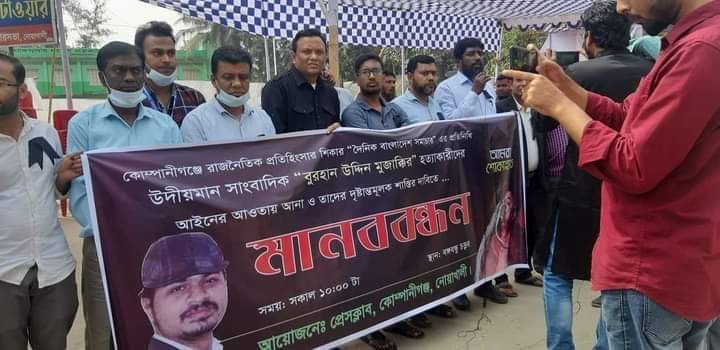 সাংবাদিক মুজাক্কির হত্যার বিচার দাবিতে মানববন্ধন করছে সোনাইমুড়ী প্রেসক্লাব